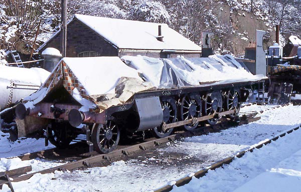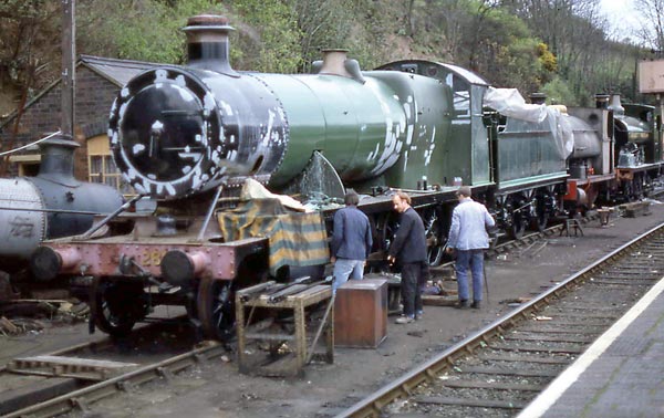 With the overhauled boiler back in the frames work was well under way with the painting, while the mechanical teams are busy re-assembling the brake rigging in this scene on 28th April 1985. Note the temporary addition of the copper capped chimney. |