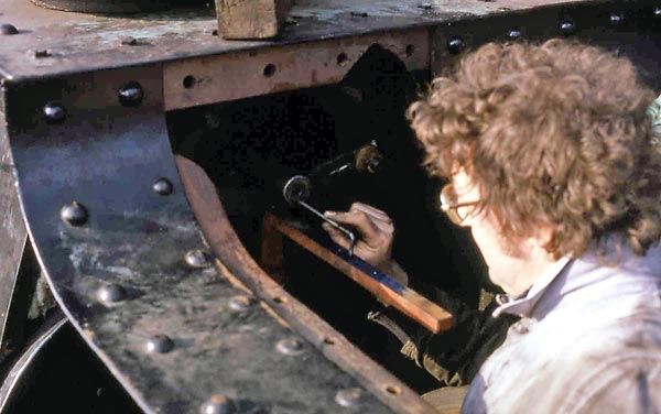 Using a spare boiler tube as a support Paul Burns (left) and Henry Edwards manoeuvre the frozen valve liner into position in the right hand front valve chest during the re-lining operation on 16th July 1983. |
